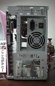 問題はその上にあるAGP。最近はPCIじゃなくて、ここにグラフィックボードさすんだよねー(時代から取り残されている私)。ここが筐体内部の仕切り板とぶつかるっぽい。でも、電源ユニット自体は仕切り板から少し離れているので、仕切り板をカードがささる程度にくり抜いちゃえば、AGPにボードがささるな。よし決定。
