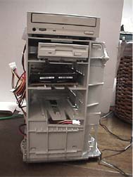カバーをはめたいんですが、フロントパネルを加工しないとCD-ROMやフロッピーの出し入れができない。バックパネルなんか1からつくらなきゃならないし。やっぱ、拡張ボードがタイラップで上から吊されているってのはまずいよねえ。